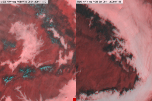 | Figure 10: Valley fog in HRV Fog RGB images for 08 January 2014 at 11:10 UTC (left) and 8 November 2008 at 07:55 UTC (right) |