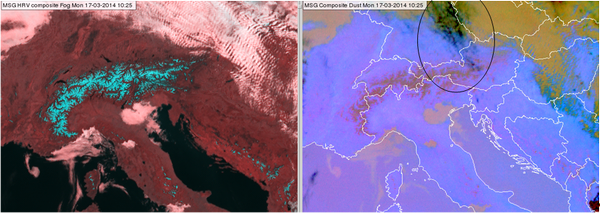 | Figure 12: HRV Fog RGB (left) and Dust RGB (right) for 17 March 2014 at 10:25 UTC. The encircled area is covered by thin cirrus clouds. |
