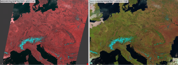 | Figure 13: HRV Fog RGB (left) and Natural Colour RGB (right) for 13 February 2014 at 11:40 UTC |