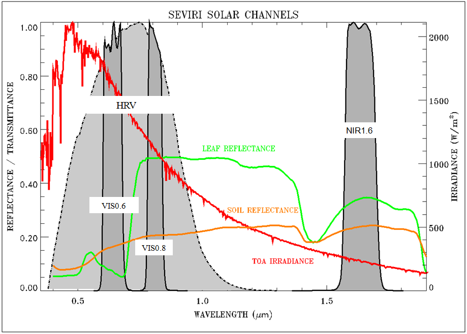 The HRV Fog RGB and the Natural Colours RGB images are composed from 'similar' channels. Both RGB types present the NIR1.6 channel in red, and visible channels are presented in green and blue. That is why the snow and the clouds will have similar colours (Fig. 13). However, the appearance of the snow-free land is very different. The Natural Colour RGB uses different channels in the blue and green components. The 0.8 and 0.6 micrometer channels (VIS0.8 and VIS0.6) together provide vegetation information which is totally missing from the HRV Fog RGB image. The reason is demonstrated in Fig. 14; the reflectivity of green vegetation differs considerably in the VIS0.8 and VIS0.6 channels. More green in the Natural Colours RGB means that the pixel is covered by vegetation containing more chlorophyll.