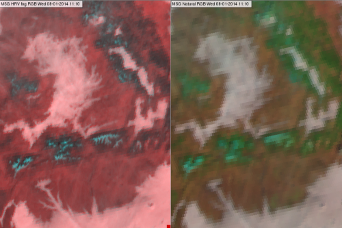 | Figure 15: Valley fog in HRV Fog RGB (left) and Natural Colours RGB (right) for 8 January 2014 at 11:10 UTC. |