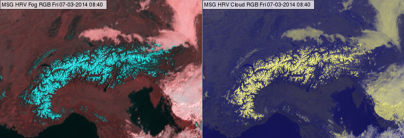 Both RGB types use HRV in two colour beams. The HRV Fog RGB combines the HRV information (high resolution cloud structure and cloud thickness) with NIR1.6 channel information (cloud phase and snow on the surface). The HRV Cloud RGB combines the HRV information with IR10.8 channel information (cloud top temperature). HRV Fog RGB is mainly useful in winter while the HRV Cloud RGB is mainly applicable during summer, as its main application is monitoring convection.