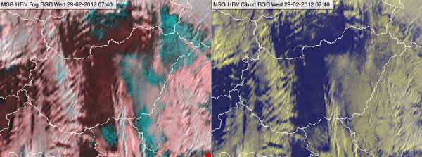 | Figure 17: HRV Fog RGB (left) and HRV Cloud RGB (right) for 29 February 2012 at 07:40 UTC |