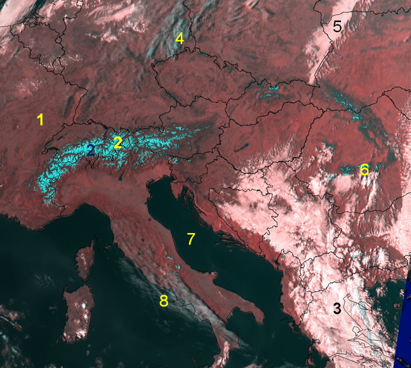 The aim of this type of RGB is to distinguish the cloud-free snow covered land from fog or low level water clouds in a high resolution image. Wintertime fog frequently forms over snowy cloud-free surfaces in high pressure conditions. It is important to identify foggy areas, for example for purposes of traffic security.