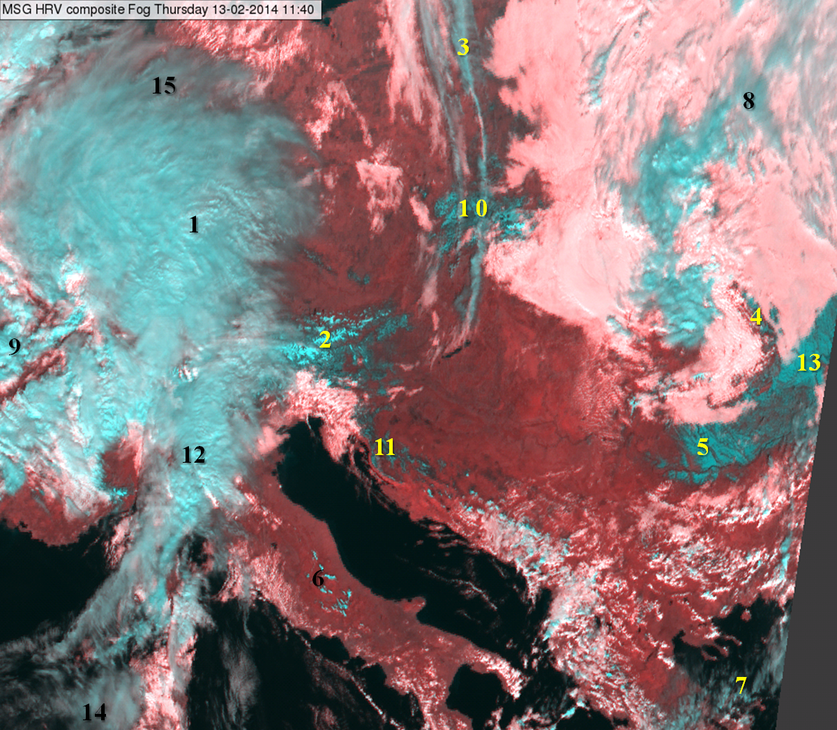 Figs. 16 and 17 compare HRV Fog and HRV Cloud RGB images. One can see that in HRV Cloud RGB there is no colour contrast between snow and water clouds. In winter, HRV Fog RGBs are more useful than HRV Cloud RGB images.