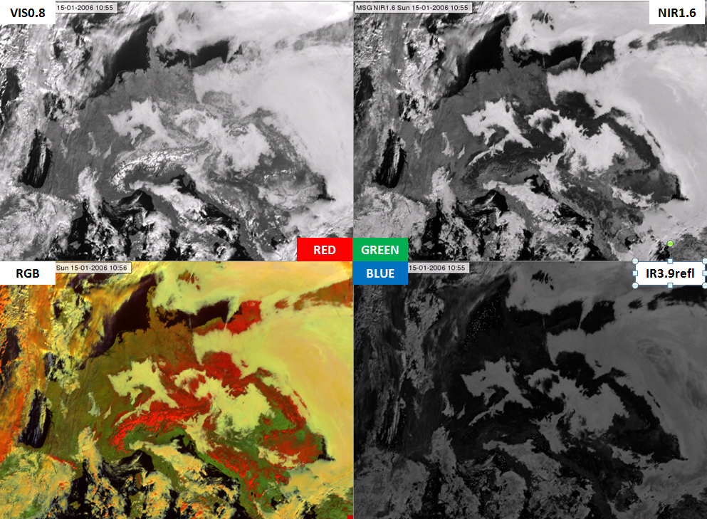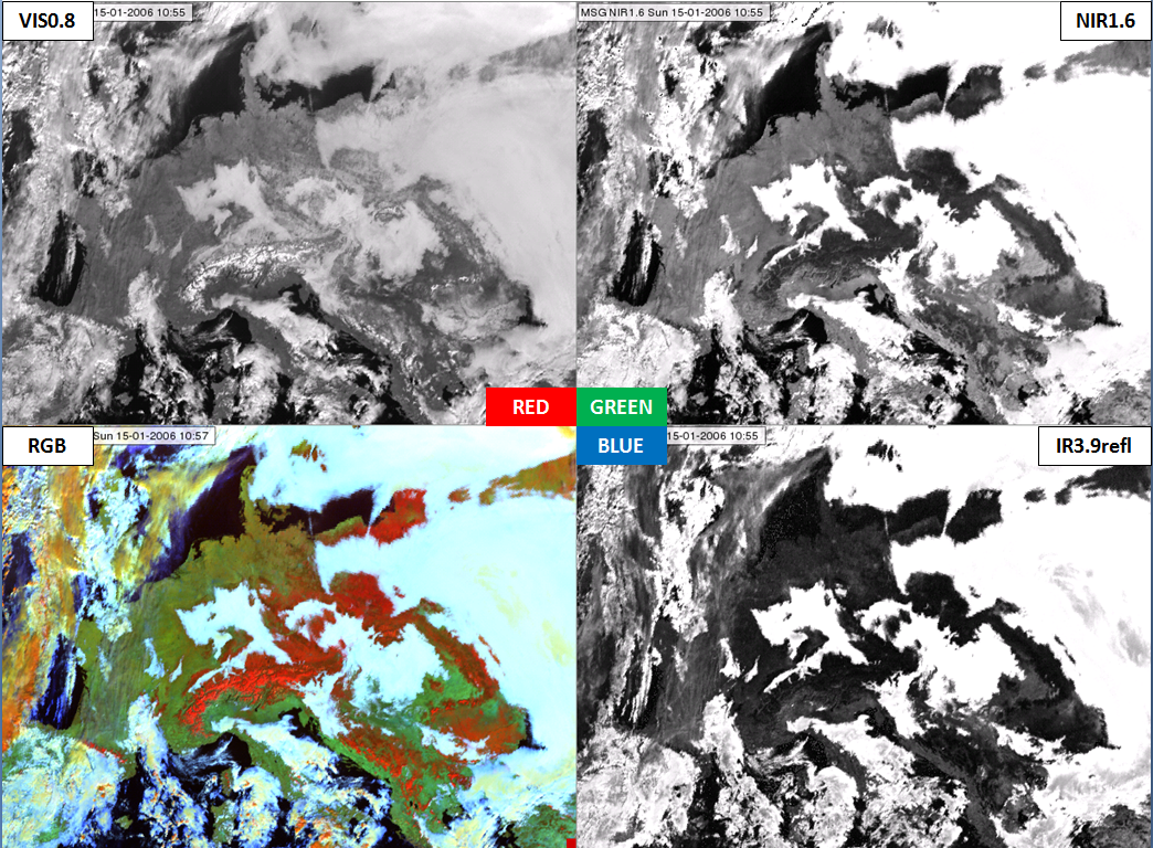 Snow RGB consists of three images: the snow is bright in one and dark in two components, while the water clouds are bright in all three components. This is the key of snow-water cloud discrimination and will ensure good colour contrast between the two.