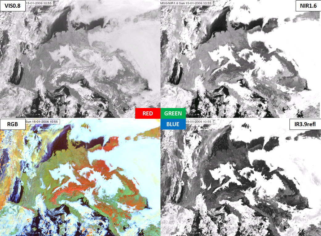 The Snow RGB is composed of the reflectivity images calculated from the VIS0.8, NIR1.6 and the 3.9 micrometer channel (IR3.9).