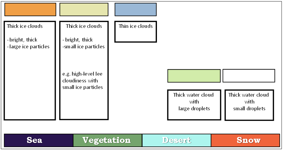 Thick ice clouds, Tin ice clouds / cirrus, Water cloud, Cirrus, Snow on mountains, Snow on mainland, Snow free land, Sea, Desert