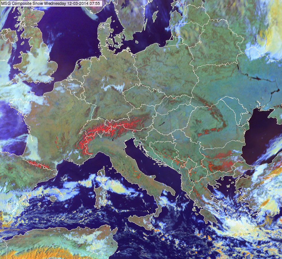 The main aim of this RGB type is to discriminate snow covered land from fog or low water clouds. Although several RGB types are usable for snow detection and for discriminating between snow and low clouds, it is the Snow RGB which provides the highest colour contrast between snow and water clouds (red-orange against white). This RGB type was tuned especially for this purpose.