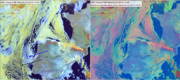 | Figure 7: Snow RGB (left) and Day Microphysics RGB (right) for 5 March 2014 at 14:40 UTC. The blue and black arrows indicate water clouds with small and large particles, respectively. |