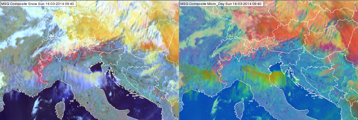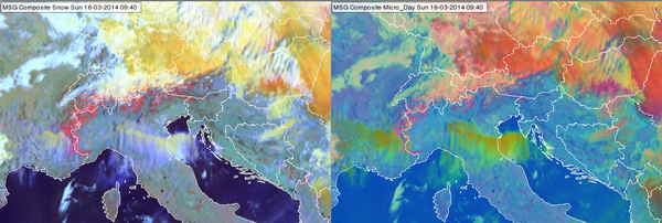 | Figure 8: High-level lee clouds with small ice particles in the Snow RGB (left) and Day Microphysics RGB (right) south and southwest of the Alps for 16 March 2014 at 09:40 UTC |