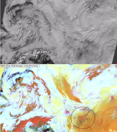 | Figure 11: HRV (top) and Snow RGB (bottom) images for 15 February 2010 at 09:40 UTC. |