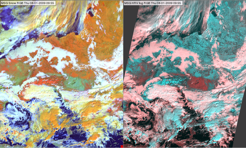 | Figure 12a: Snow RGB (left) and HRV Fog RGB (right) for 08 January 2009 at 09:55 UTC |
