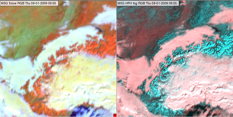 | Figure 12b: Snow RGB (left) and HRV Fog RGB (right) for 08 January 2009 at 09:55 UTC |