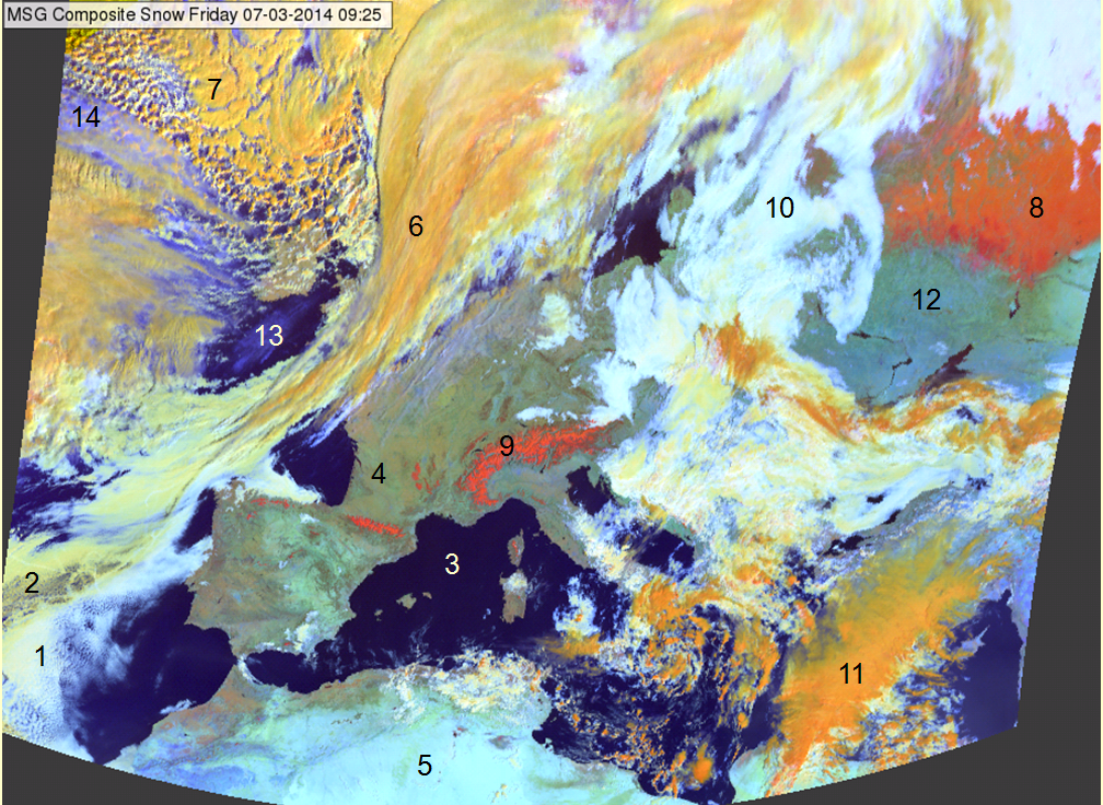 Several colours of the snow RGB are close to the natural colours: most of the water clouds are whitish, land is greenish and sea is dark blue (Fig. 6). There are also some non-natural colours: thick ice clouds are orange, snow is red-orange and the desert is bluish.