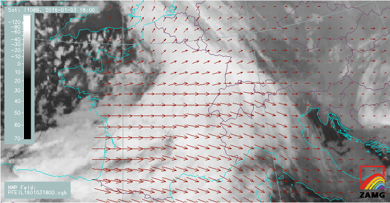 Figure 16: CMV derived from IR10.8 μm superimposed on a frontal system over Western Europe. The length of the red vectors is proportional to the displacement. The MSG image dates from 3 January 2016 at 18:00 UTC.