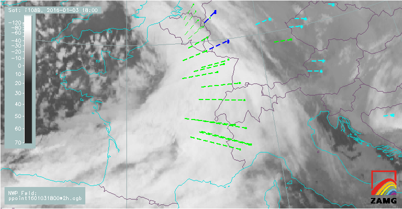 Figure 16 shows the IR-CMV superimposed on a frontal system over Western Europe. It shows the displacement of the cold front (central France) towards the east, the displacement of the warm front (Switzerland and northern Italy) towards the southeast and parts of the occlusion (northern France, Belgium) towards the northeast.