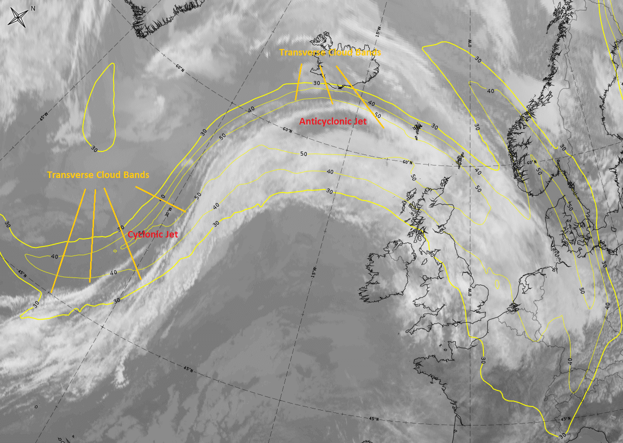 Transverse cloud bands visible in WV and IR imagery are an indication of turbulence in the upper troposphere. However, the absence of transverse bands is not a sign of a laminar atmospheric flow, since shear-gravity waves become visible only when the air is nearly saturated with moisture.
