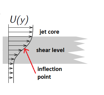 Shear-gravity waves (also called Kelvin-Helmholtz waves) are often seen as substructures in high level cirrus clouds and are closely connected to the subtropical or polar jet stream. Their development only depends on the vertical velocity profile of the wind. The wind profile should have at least one inflection point. This inflection point can be found below and above the jet core (figure 1).