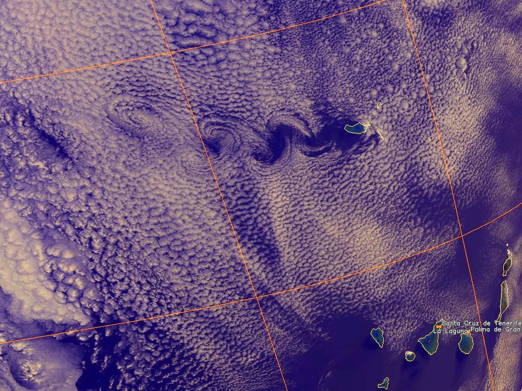 Figure 1: A Kármán vortex street has formed in the lee of Madeira. Metop-A image (VIS0.6, VIS0.8, IR11.0) from 22 February, 2011.