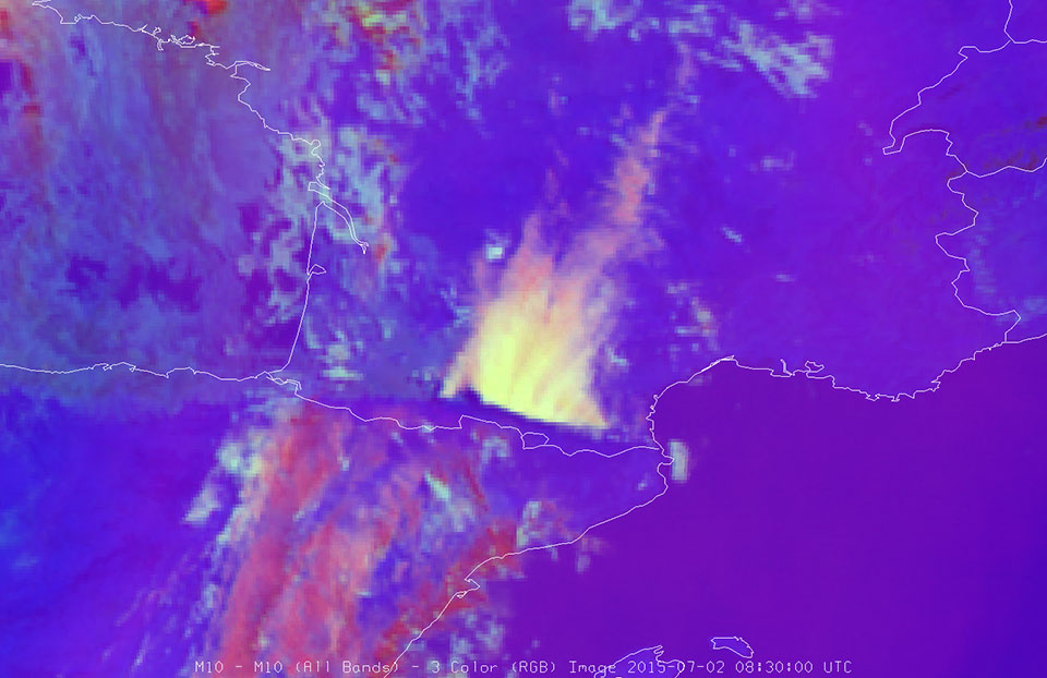 Figure 4: Meteosat-10 Severe Storms RGB, 2 July 2015 at 08:30 UTC. High lee clouds formed north of the Pyrenees.