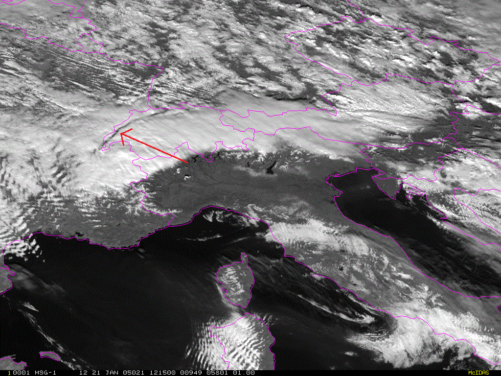 Figure 2: Foehn gap over the northern parts of Switzerland (red arrow). MSG HRV from 21 January, 2005 at 12:15 UTC.
