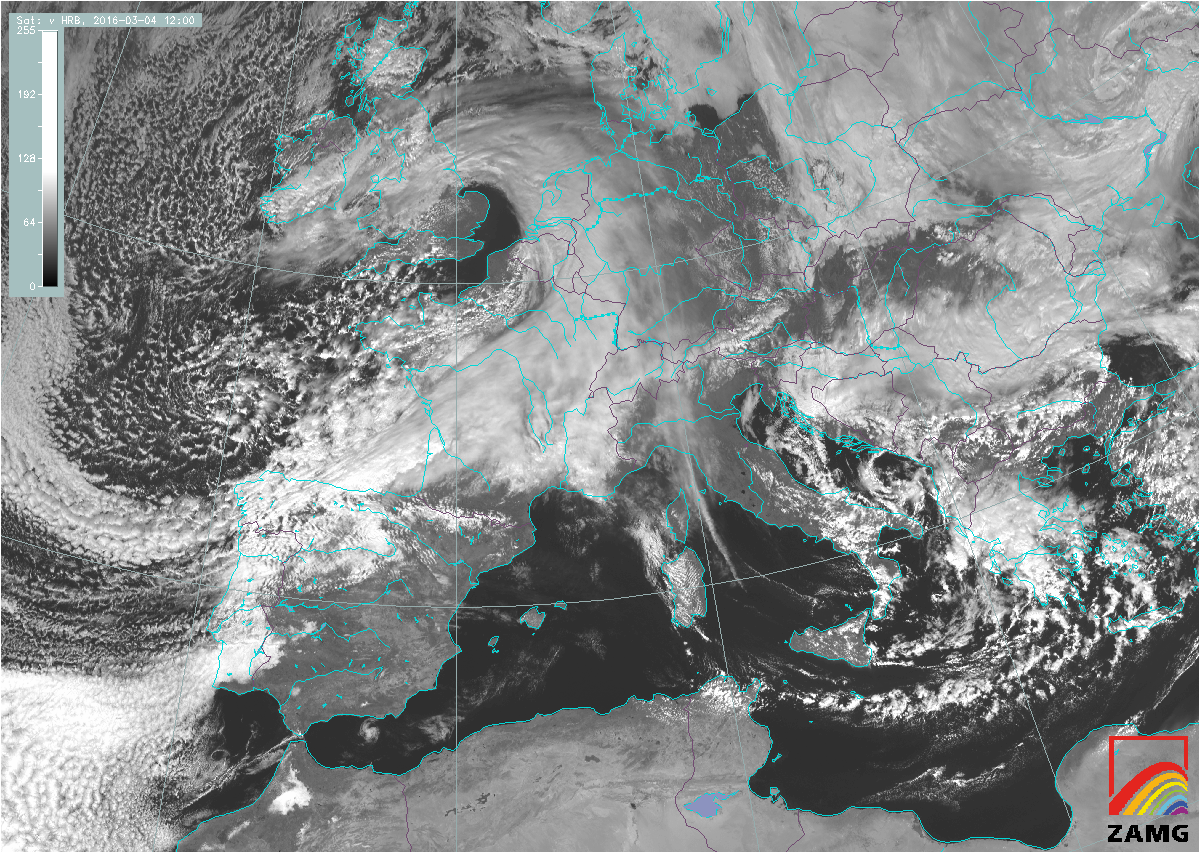The HRV satellite image below shows a frontal system over Western Europe and an older low pressure area centered over Greece.
