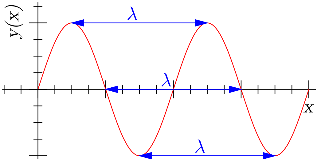 Figure 8: Plot of a sine wave showing three pairs of corresponding points between which wavelength (λ) can be measured. ©Richard F. Lyon, CC BY-SA 3.0