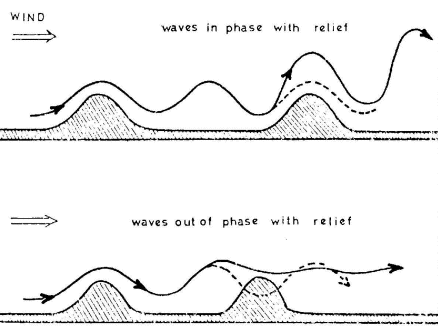 In cases with complex orography (e.g. several mountain chains in parallel), lee waves may be damped or enhanced depending on the relationship between wave length and distance between the mountain chains (figure 9).