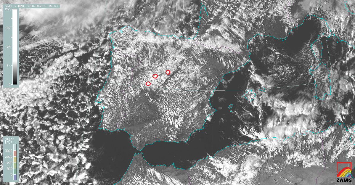 Atmospheric lee waves may also act as a trigger for convection. The vertically lifted air at the wave crest is cooled adiabatically, but at the same time, when cloud droplets form, latent heat is released. In a potentially unstable stratification of the surrounding air, this little extra heat can be crucial for initiating convection. Cloud lines mark the wave crests of the atmospheric gravity waves all over the Iberian Peninsula. At some locations further downstream, the HRV satellite image shows convective cells instead of thin cloud lines (red circles in figure 5). These are the regions where convective initiation takes place.
