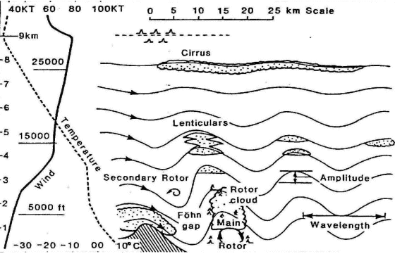 Various cloud patterns are summarized under the name of lee cloudiness: rotor clouds, lenticularis clouds, cirrus clouds, etc. What they all have in common is that they are generated in a stable atmosphere by a surface elevation which makes the air rise above condensation level. The image below gives an overview of the different cloud types, though note that they do not all need to occur simultaneously.