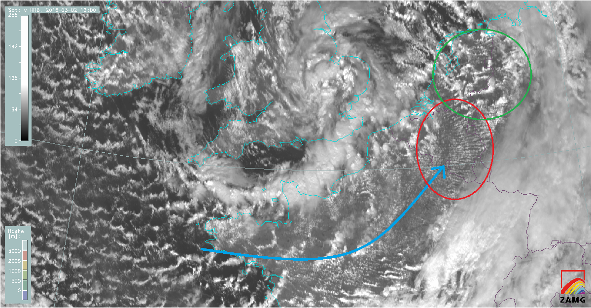 Figure 7: MSG HR-VIS image from 2 March, 2016 at 12:00 UTC. The blue arrow shows the main wind direction.