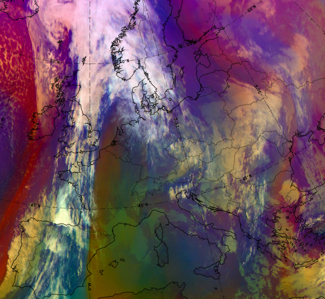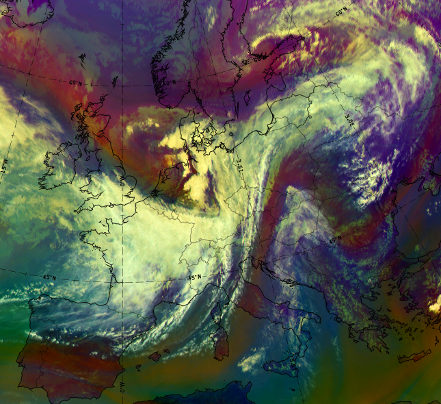 Figure 2: Foehn gap over the northern parts of Switzerland (red arrow). MSG HRV from 21 January, 2005 at 12:15 UTC.