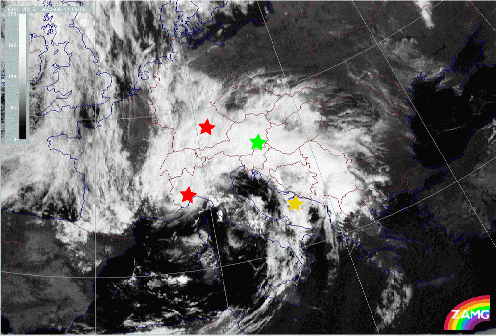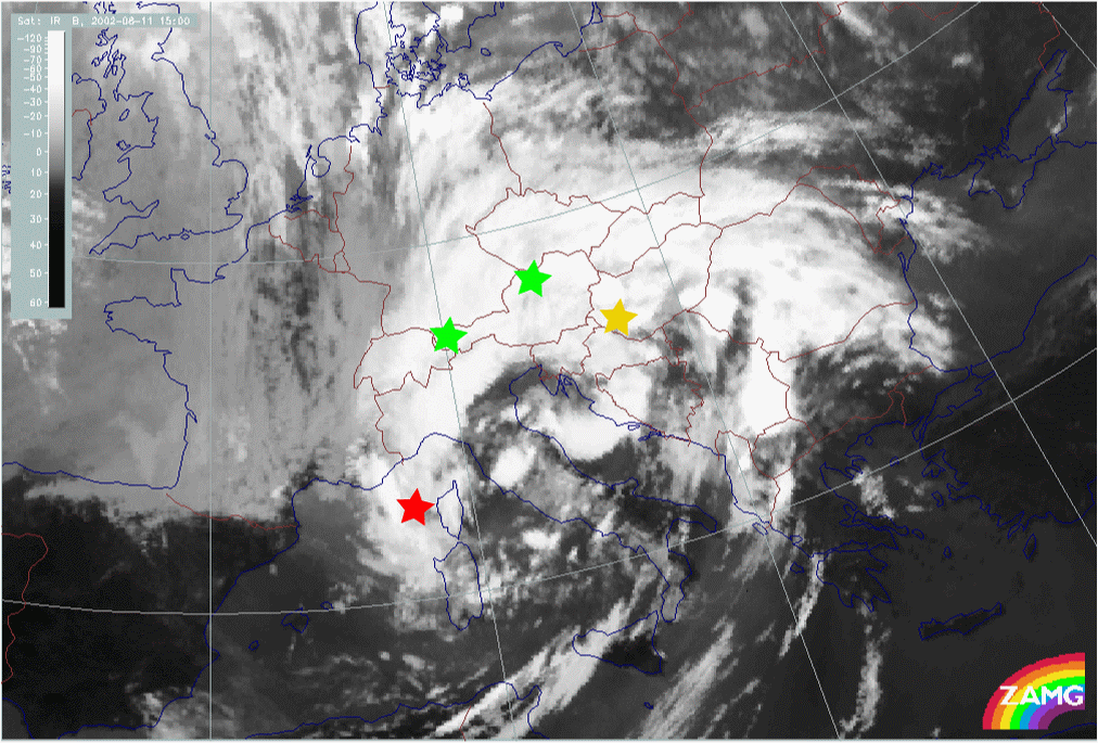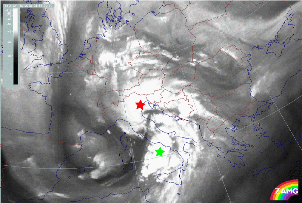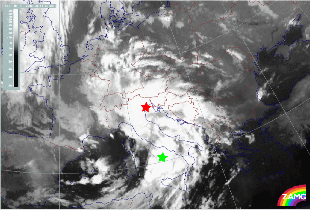 During the 11th of August Mediterranean lows develop and then develop further into an Occlusion cloud spiral: This can easily be seen in the satellite image loops (IR, WV and VIS); once again, several processes at meso- and synoptic-scale can be identified.