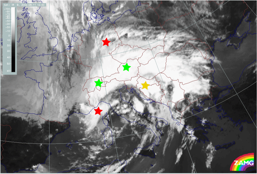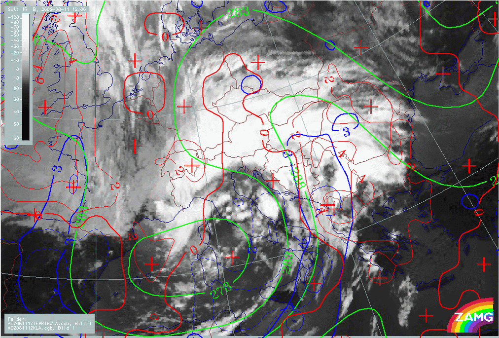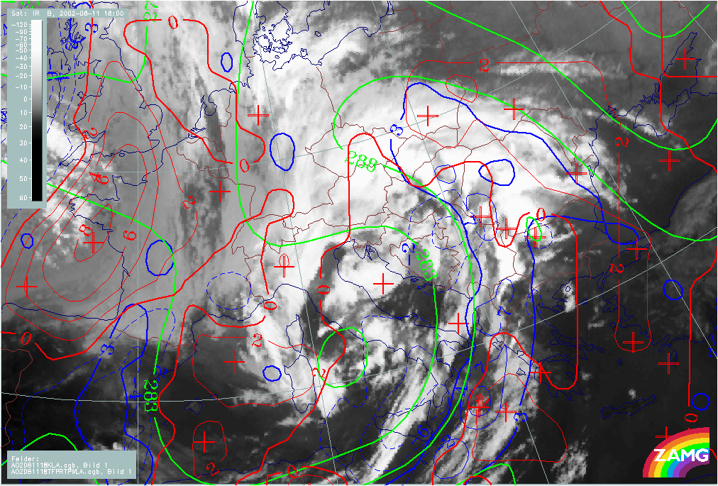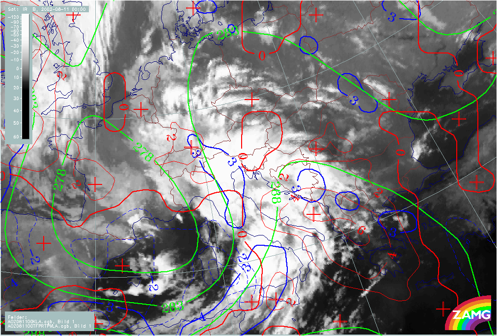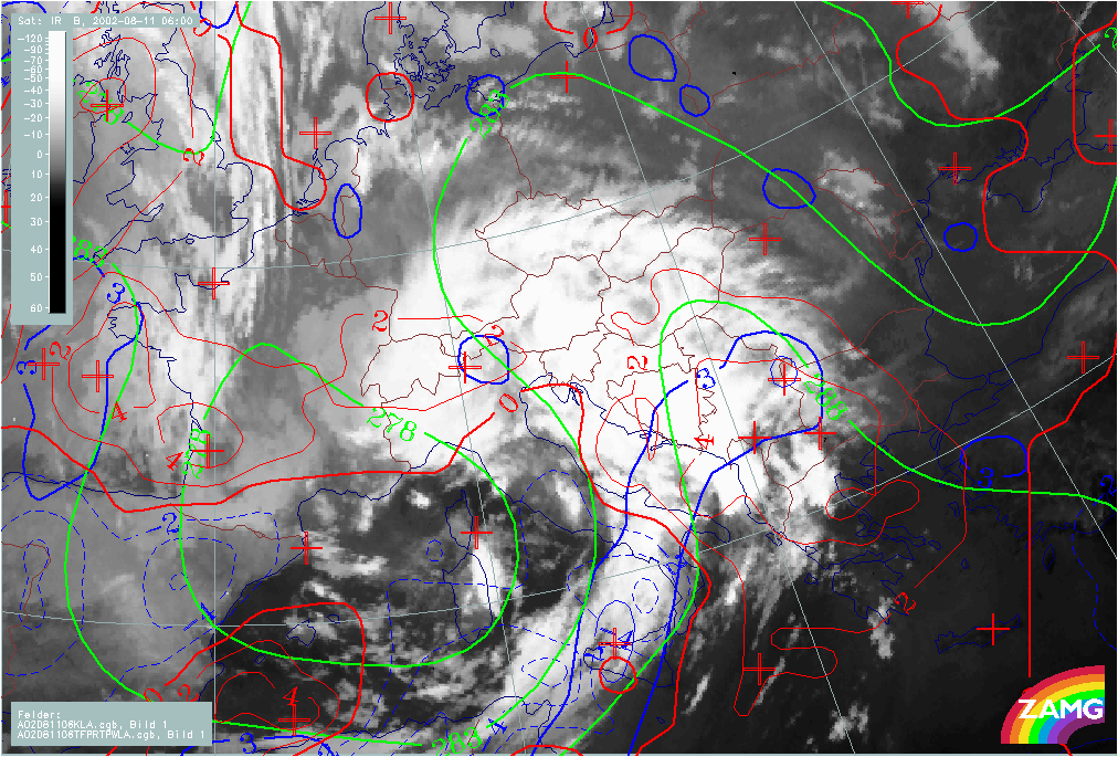 11 August 2002/00.00 UTC - Meteosat IR image; blue: thermal front parameter (TFP) 500/1000 hPa, green: equivalent thickness 500/1000