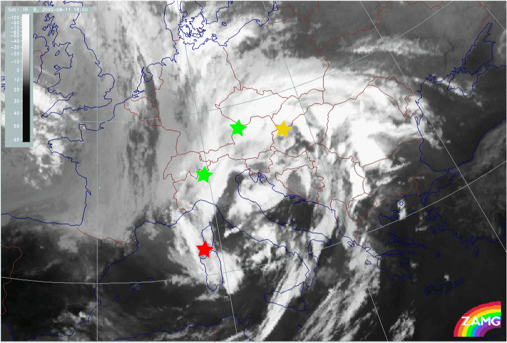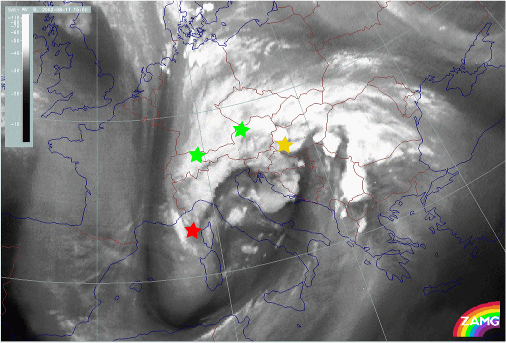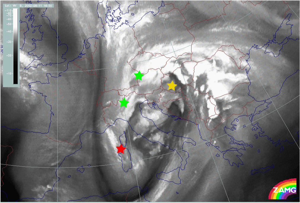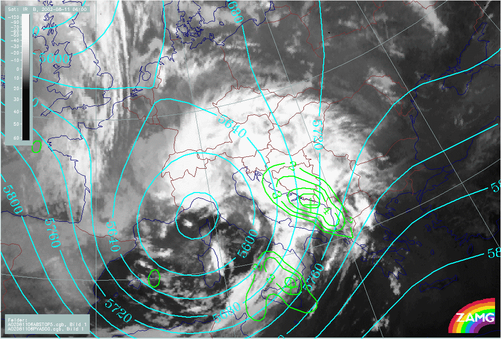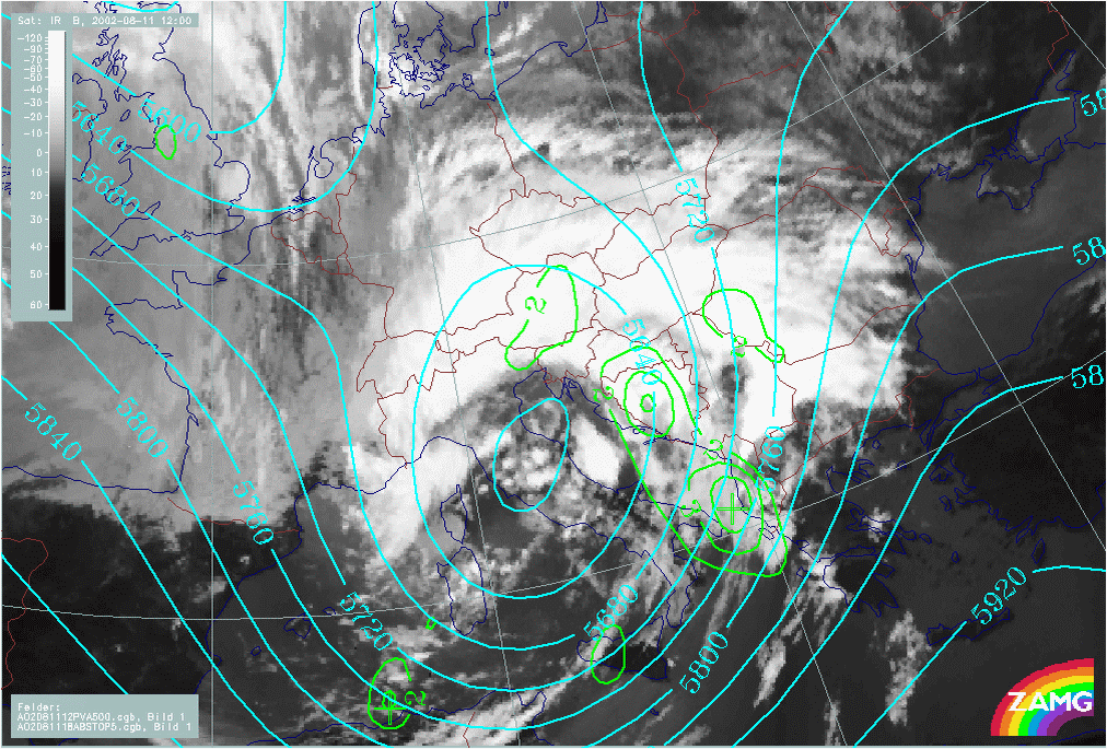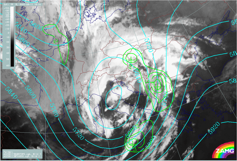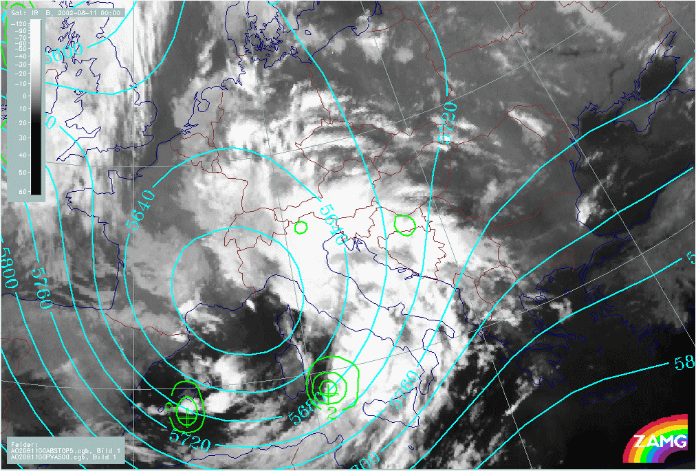 11 August 2002/00.00 UTC - Meteosat IR image; green: positive vorticity advection (PVA) 500 hPa, cyan: height contours 500 hPa; 00.00 -