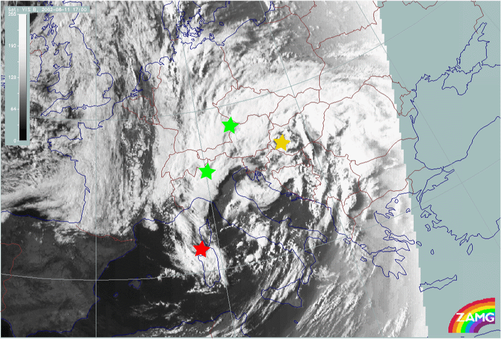 - The cloud spiral (red stars) and the intensification area over mid Italy (green stars)