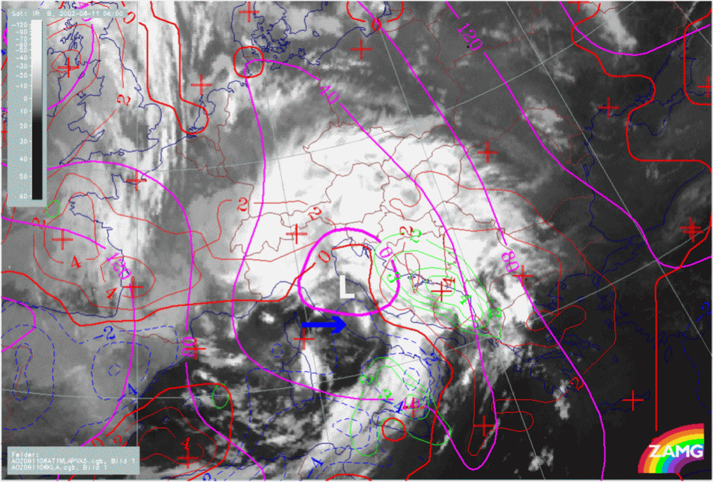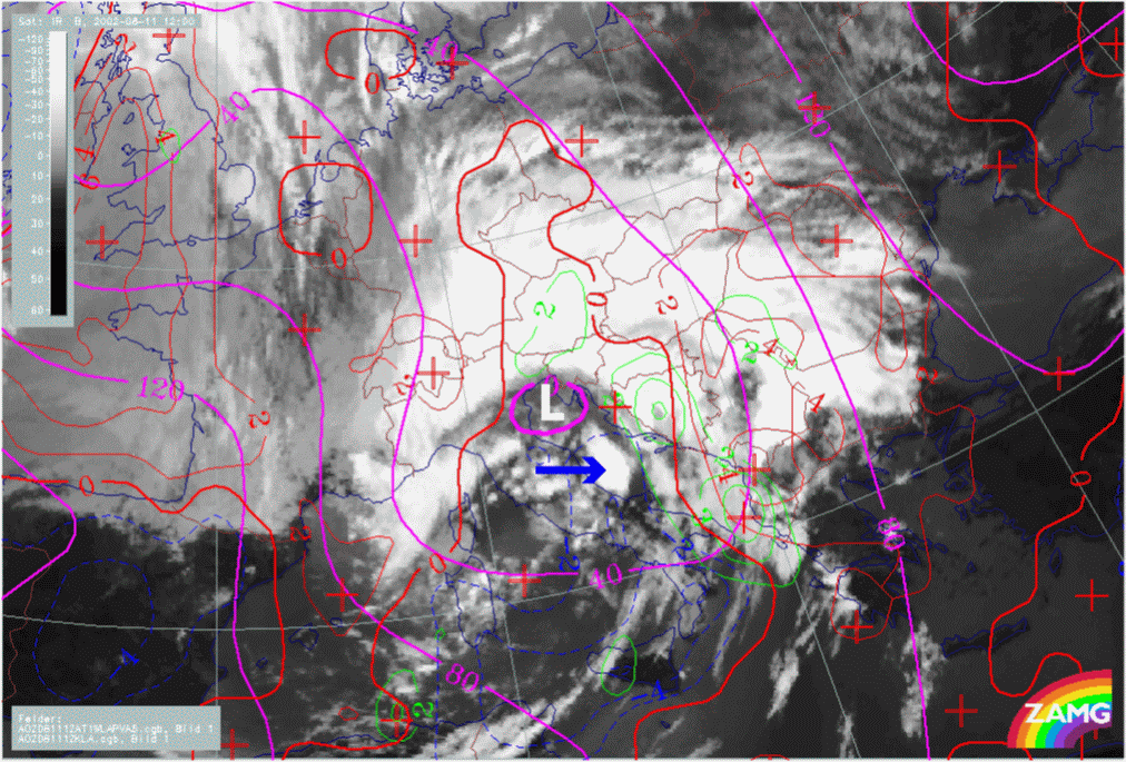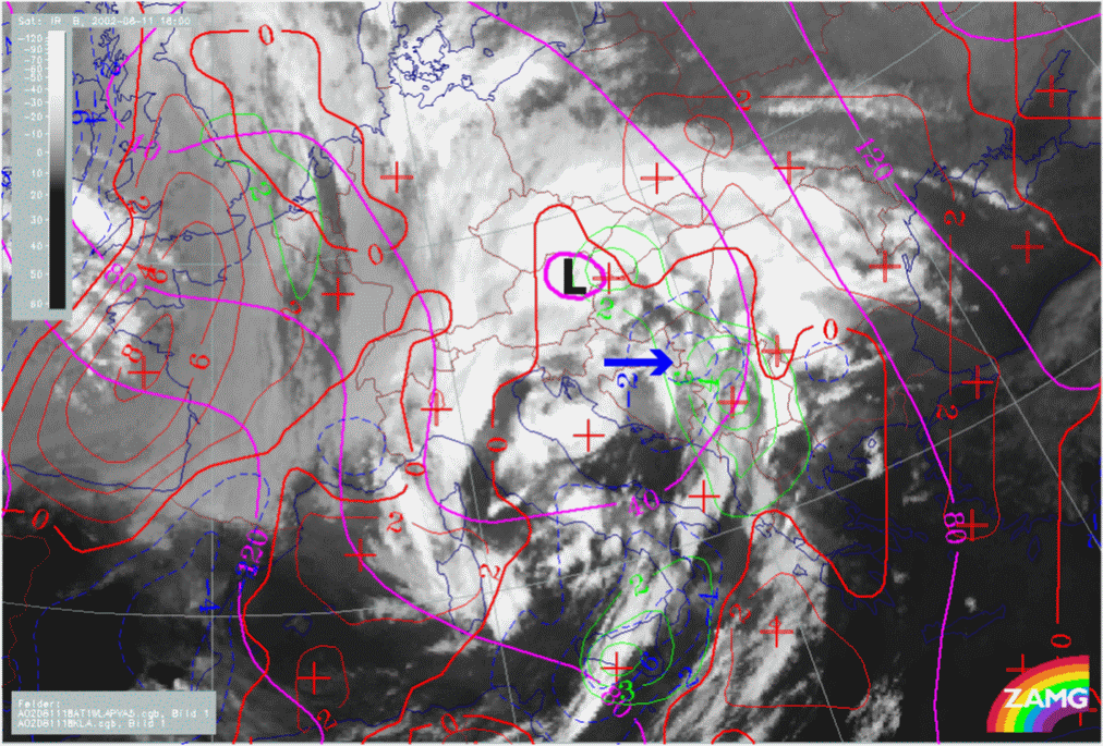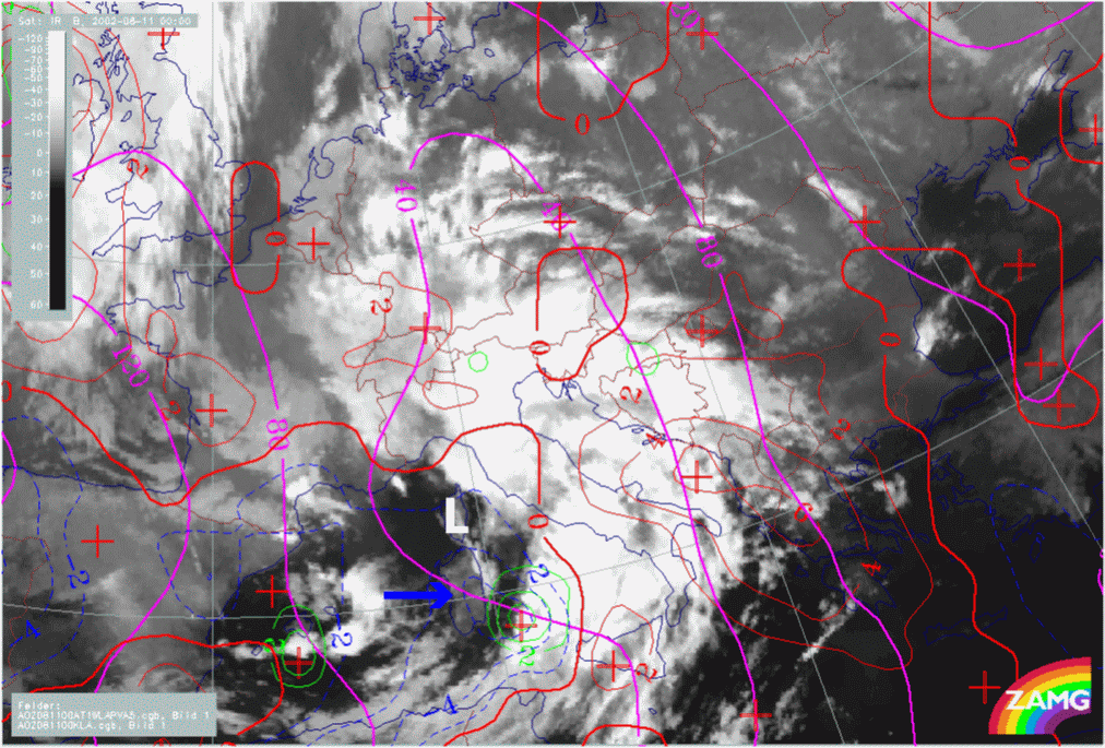 11 August 2002/00.00 UTC - Meteosat IR image; magenta: height contours 1000 hPa; green: positive vorticity afvection (PVA) 500 hPa,