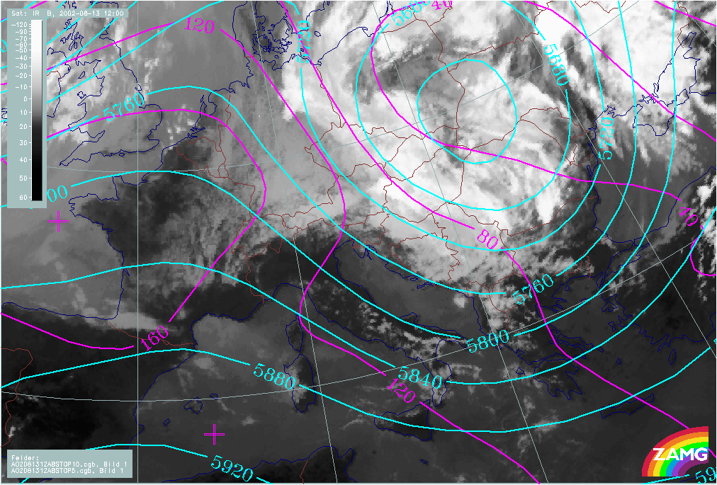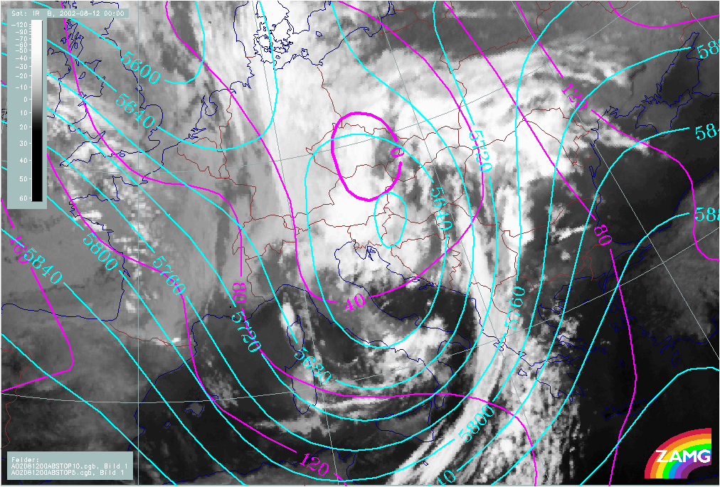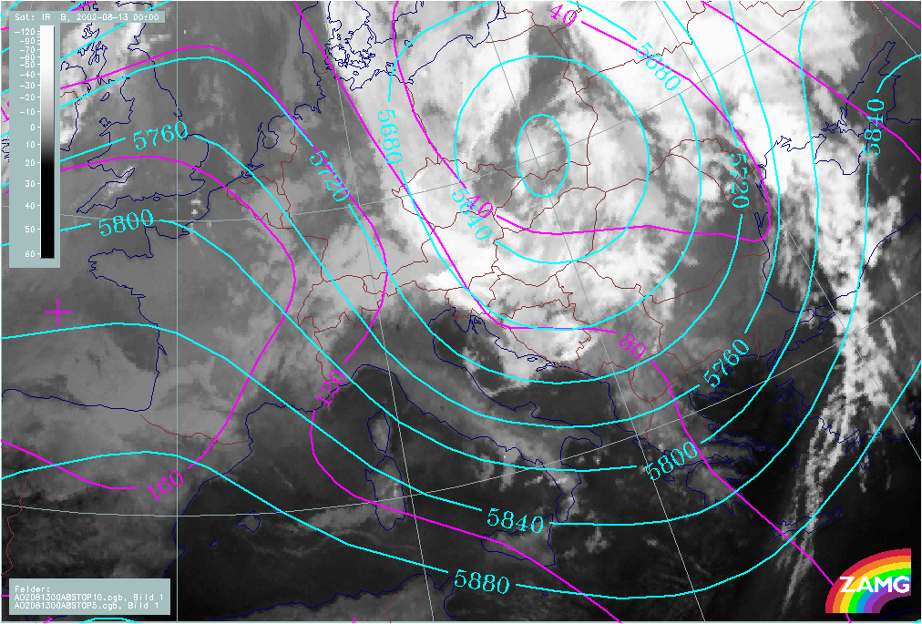 12 August 2002/00.00 UTC - Meteosat IR image; magenta: height contours 1000 hPa; cyan: height contours 500 hPa; 12 August/00.00 - 13