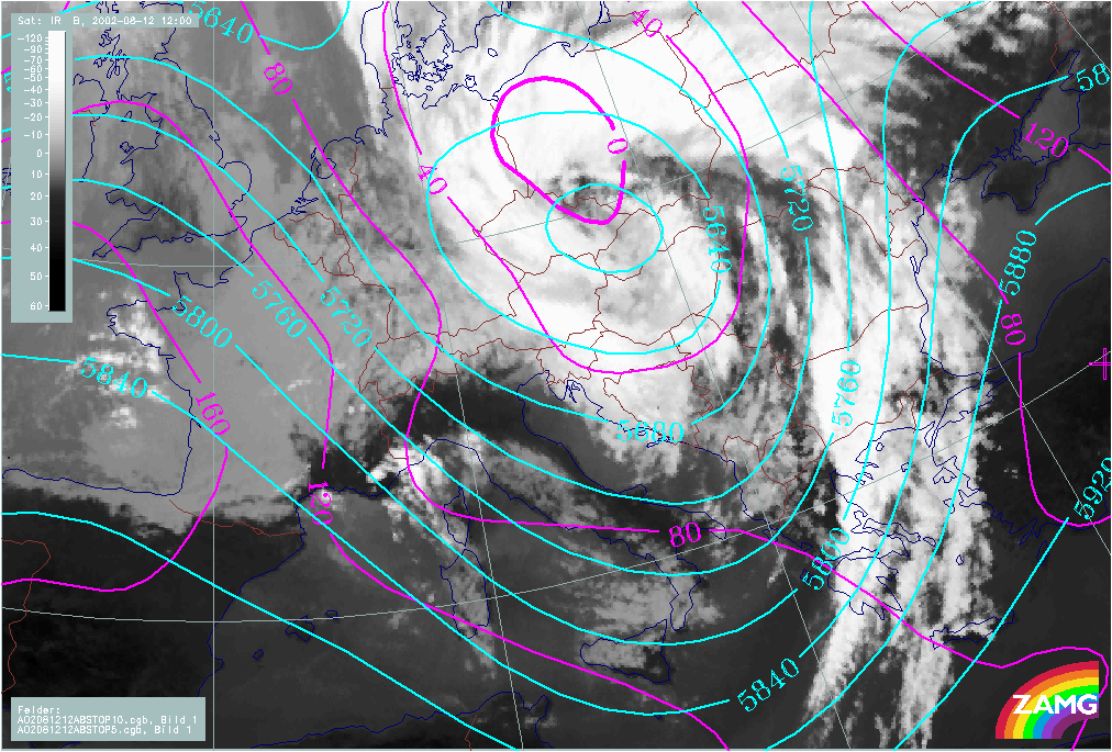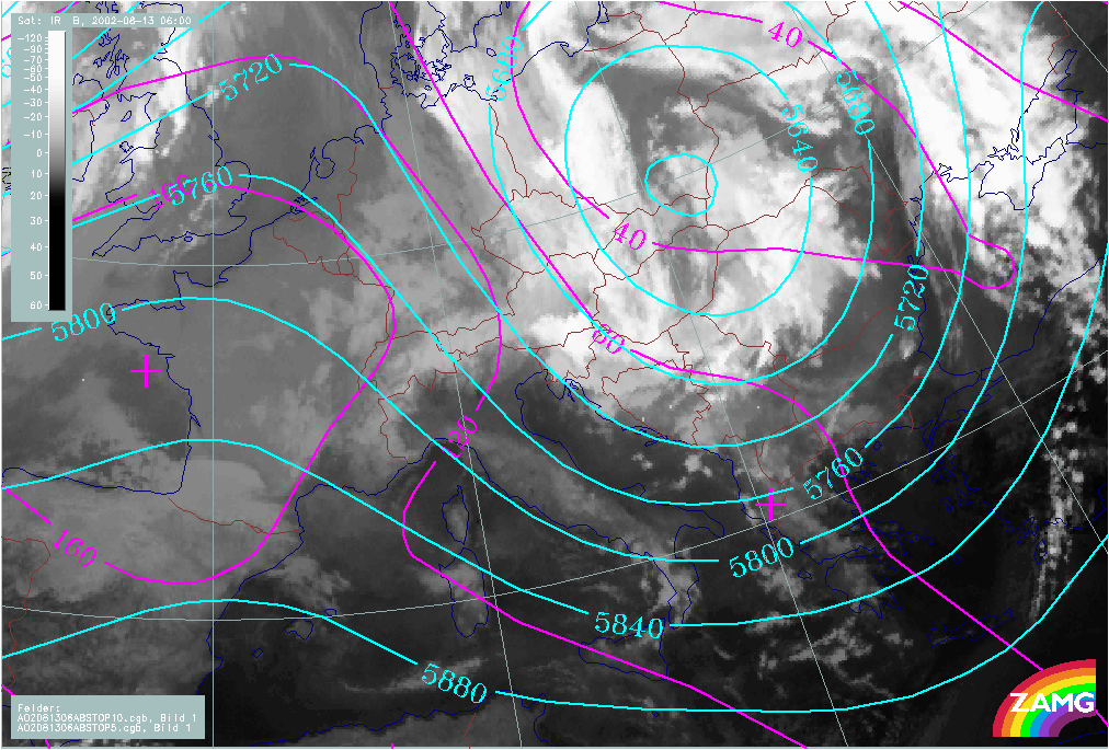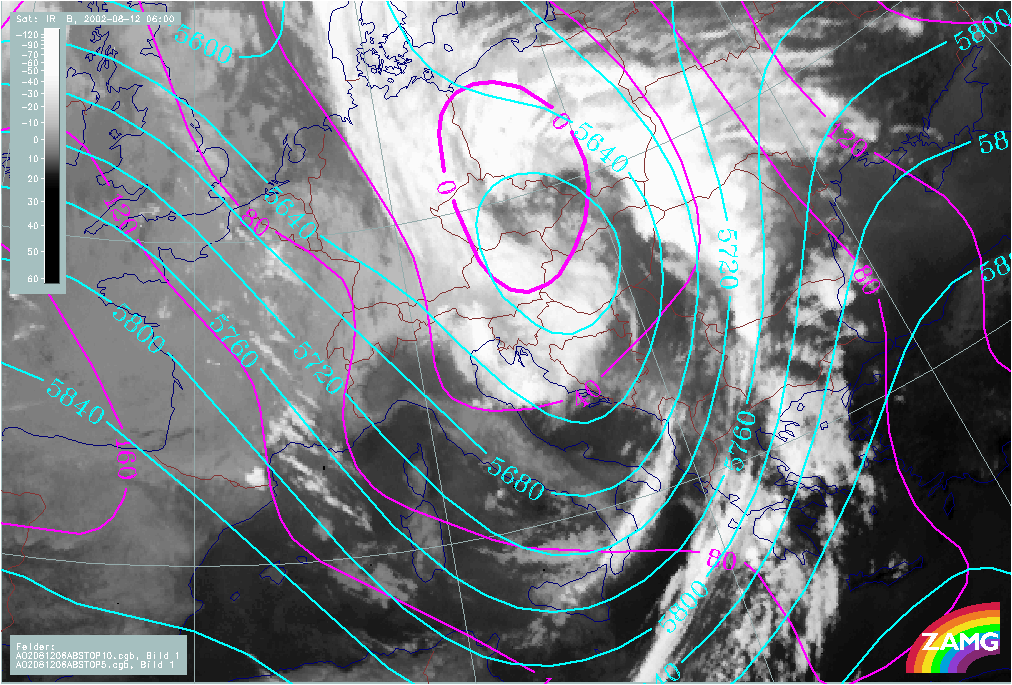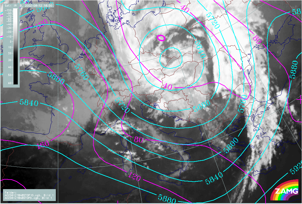 The path of the Mediterranean surface and Upper Level Lows exactly follows that of a classical 5b low, from the Mediterranean over Hungary and E. Austria further to the North across Slovakia and the Czech Republic to Poland. As a consequence of this path and taking into account Stau effects at the mountains, severe weather can be expected over the whole of Austria and surrounding countries. This catastrophic case led to a disastrous flood situation effecting not only the countries mentioned above, but also much of eastern Germany.