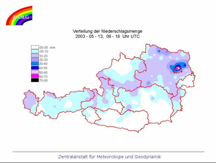Within the unstable prefrontal air, the mature Cb stage is reached in the early afternoon due to diurnal heating. Besides the hail which caused damage in the western and north-western parts, a tornado was also observed. The total amount of rainfall is shown below. It exceeds the average monthly amount.