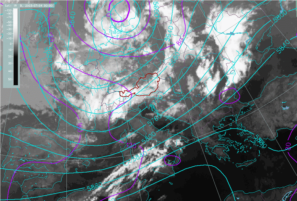 04 July 2003/00.00 UTC - Meteosat IR image; violet: height contours 1000 hPa, cyan: height contours 500 hPa