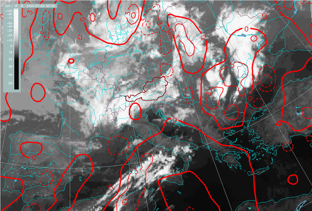 04 July 2003/00.00 UTC - Meteosat IR image; red: temperature advection 1000/500 hPa