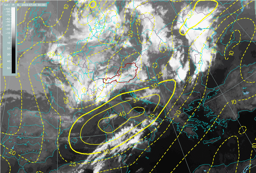 04 July 2003/00.00 UTC - Meteosat IR image; yellow: isotachs 300 hPa