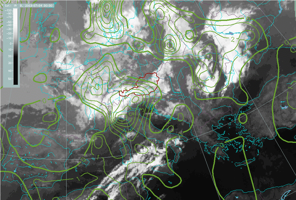 04 July 2003/00.00 UTC - Meteosat IR image; green: vorticity advection 300 hPa