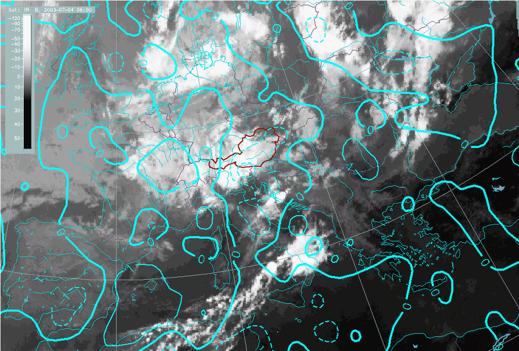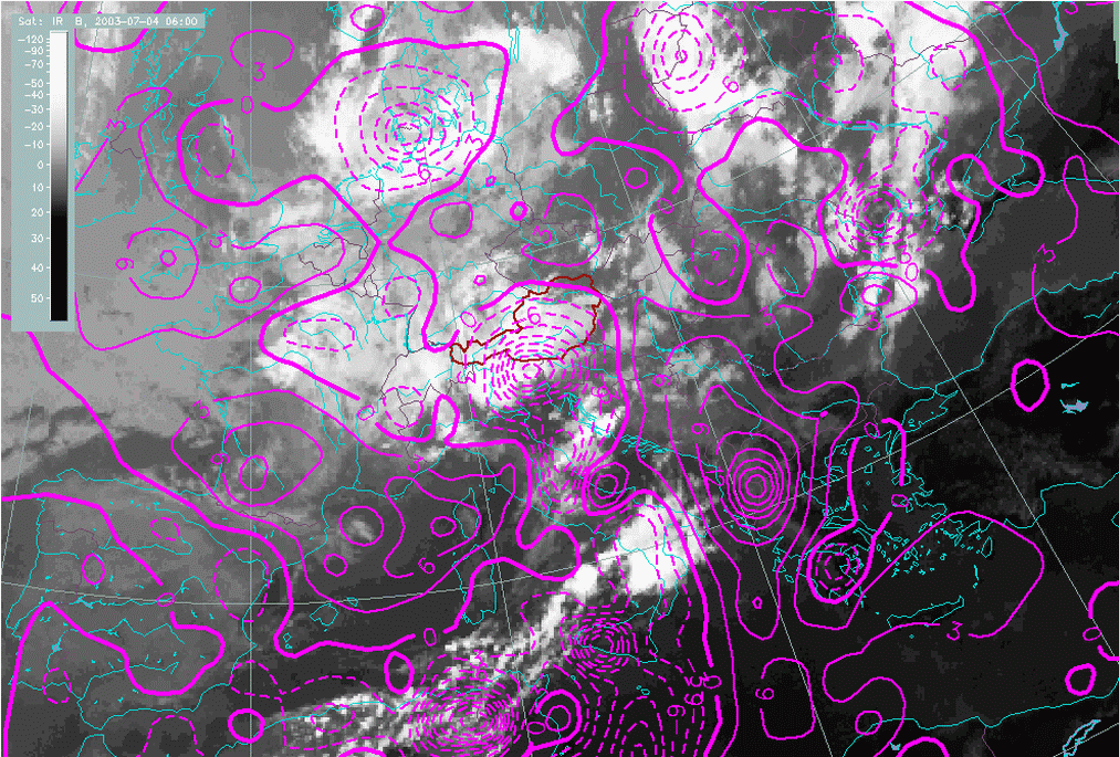 04 July 2003/06.00 UTC - Meteosat IR image; cyan: divergence 850 hPa