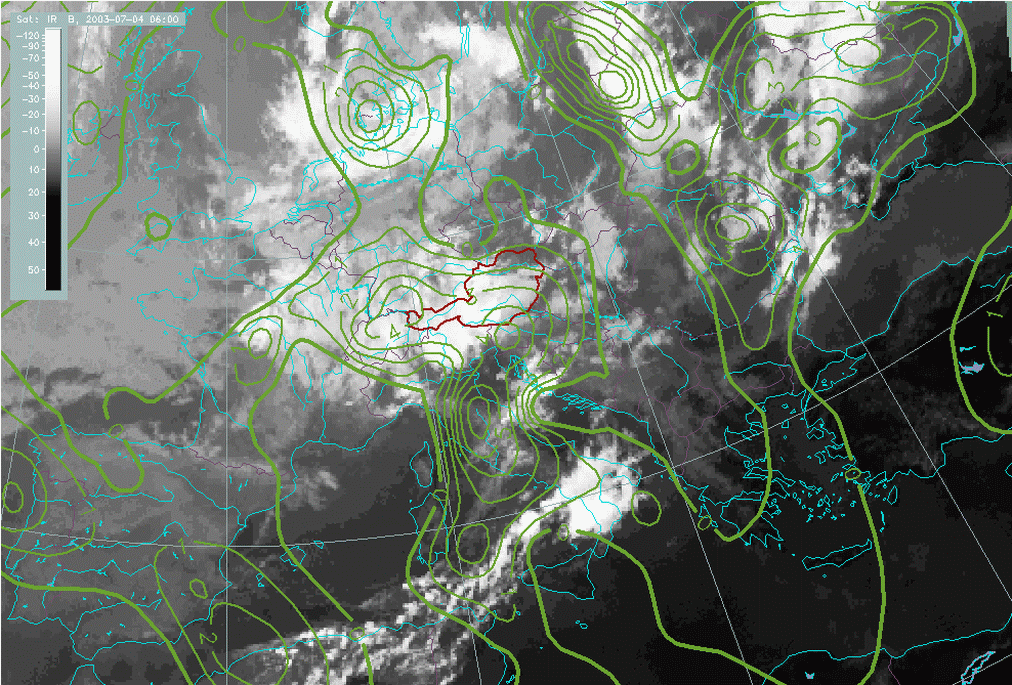 04 July 2003/06.00 UTC - Meteosat IR image; green: vorticity advection 300 hPa