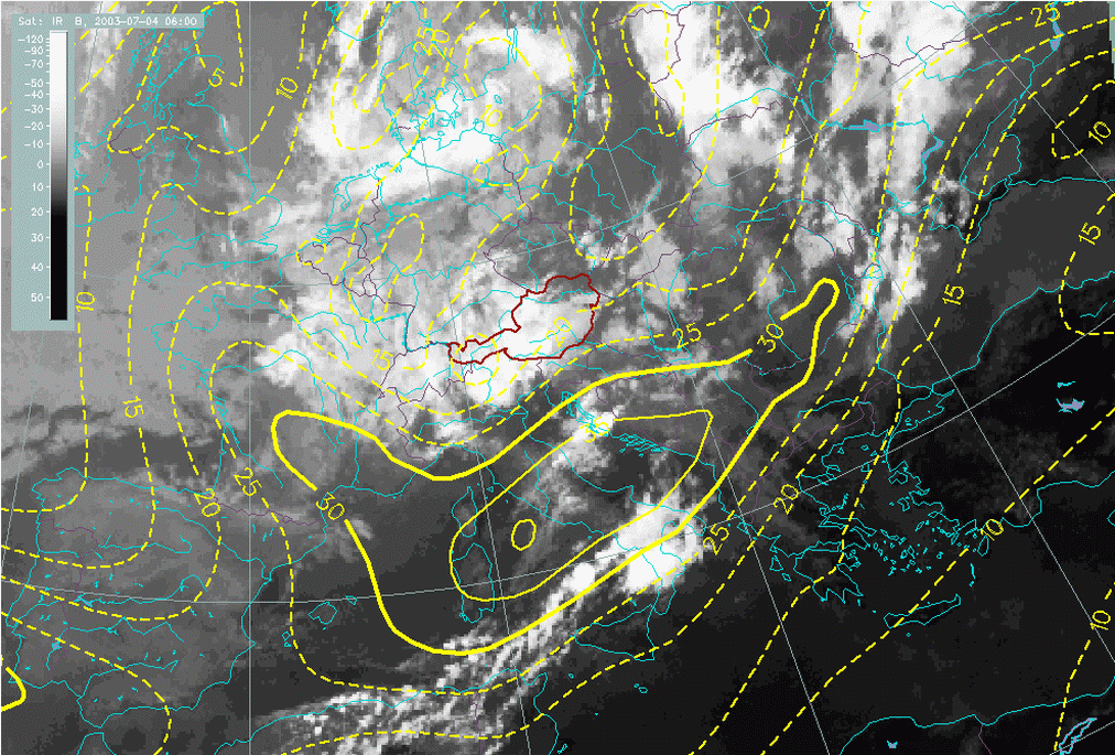 04 July 2003/06.00 UTC - Meteosat IR image; yellow: isotachs 300 hPa
