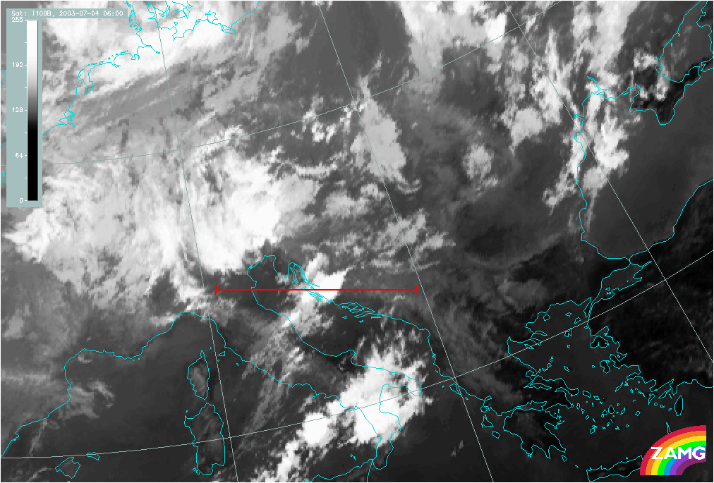 04 July 2003/06.00 UTC - Meteosat WV image; position of vertical cross section indicated