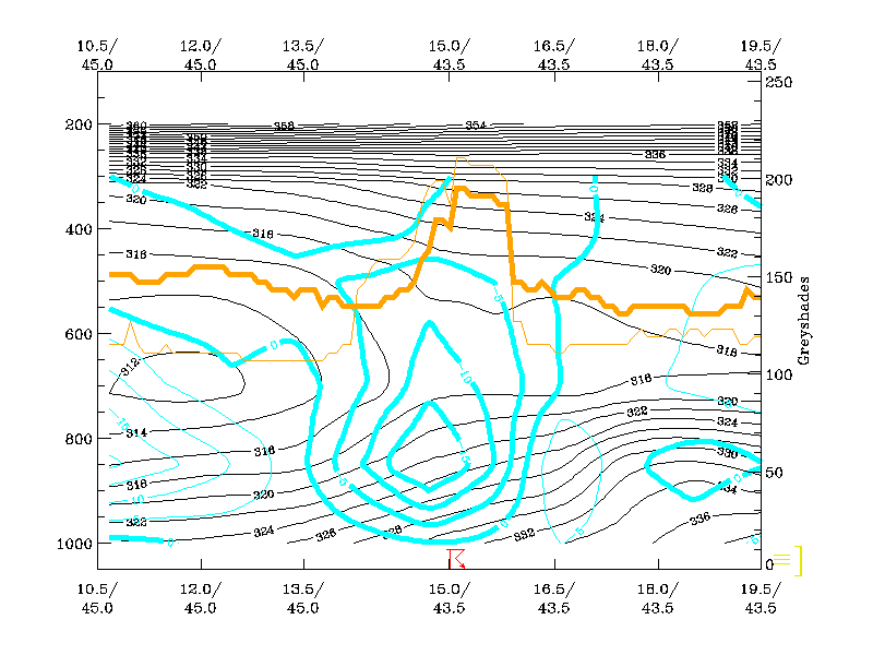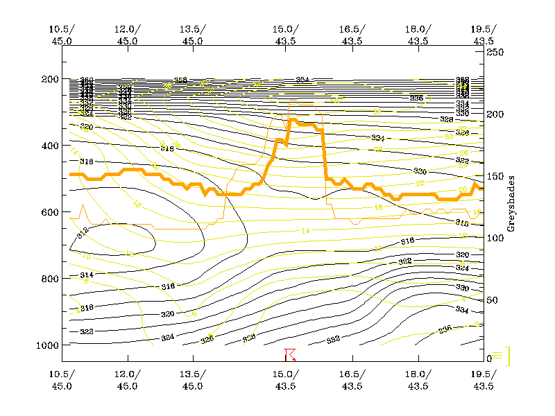 04 July 2003/06.00 UTC - Vertical cross section; black: isentropes (ThetaE), yellow: isotachs, orange thin: IR pixel values, orange